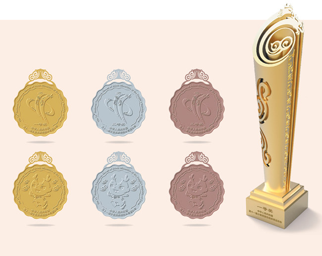 獎杯《龍鳳書卷》,靈動而不失莊重。獎杯上端外觀基于會徽核心圖形“龍鳳”,具有較高的辨識度。龍鳳組成“11”圖案,呈相依相伴騰飛之勢,中間升騰古老的祥云圖案,彰顯中華文明生生不息的活力。獎杯底座由三級臺階組成,寓意“三個離不開”(漢族離不開各少數(shù)民族,各少數(shù)民族離不開漢族,各少數(shù)民族之間也互相離不開)思想和步步高的美好祝福,激勵運動員奮力拼搏。