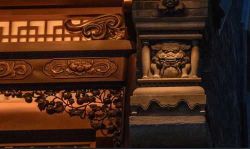 12號樓主題為獅子,主題來源于三門峽靈寶函谷關(guān),象征“事事如意”的獅子在柱子、平板枋、額枋、卡子花、假梁頭等構(gòu)件均有出現(xiàn)。
