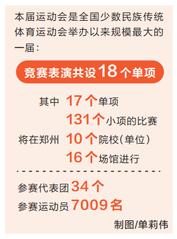 據競賽表演部相關負責人介紹,本屆民族運動會競賽表演共設18個單項,馬上項目比賽已于7月12日至17日在呼和浩特圓滿結束,其他17個單項,131個小項的比賽將在鄭州10個院校(單位)、16個場館進行;參賽代表團34個,參賽運動員7009名,是全國少數民族傳統(tǒng)體育運動會舉辦以來規(guī)模最大的一屆。另外,本屆運動會還將突出河南省武術大省的優(yōu)勢,“少林拳”和“陳氏太極拳”等也將一一呈現。