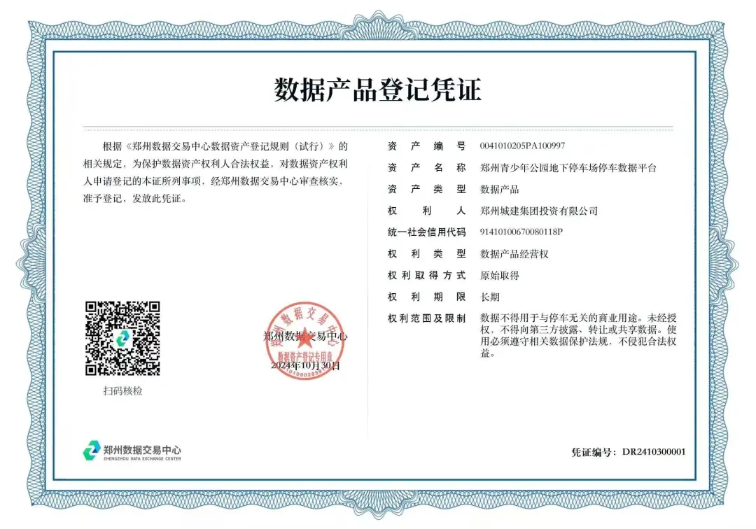 10月30日,城發(fā)集團(tuán)下屬子公司鄭州城建集團(tuán)投資有限公司(以下簡稱“城建集團(tuán)”)在鄭州數(shù)據(jù)交易中心成功完成了“鄭州青少年公園地下停車場(chǎng)停車數(shù)據(jù)平臺(tái)”數(shù)據(jù)產(chǎn)品的資產(chǎn)登記,喜獲數(shù)據(jù)產(chǎn)品登記憑證,成為鄭州市首家將停車數(shù)據(jù)資產(chǎn)入表的國有企業(yè)。