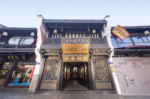 以朱炳仁團隊打造的銅屋系列為例:入駐亳都·新象的“中原銅屋”是其全國第四家、華中第一家銅屋。建筑內(nèi)部以超高、超寬的銅板工藝打造出“銅盒子”視覺焦點,磚木結(jié)構(gòu)搭配著銅與玻璃的碰撞,產(chǎn)生時空交錯的美感。“中原銅屋”整體風(fēng)格和中原民居相適配,當(dāng)訪客的指尖掠過帶有紋飾的銅器,恰似完成一場跨越三千年的文明對話——要知道,商城遺址曾出土過杜嶺方鼎等商代青銅文明的巔峰之作,這份地域文化根脈在此得到了呼應(yīng)。