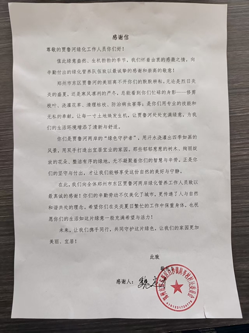 近日,鄭州市賈魯河綠化養(yǎng)護(hù)工作收獲暖心認(rèn)可。鄭東新區(qū)崗李村村委向養(yǎng)護(hù)團(tuán)隊(duì)贈(zèng)送錦旗和感謝信,以“朝迎晨露修枝葉,暮披霞光護(hù)綠茵” 贊揚(yáng)工作人員的辛勤付出。