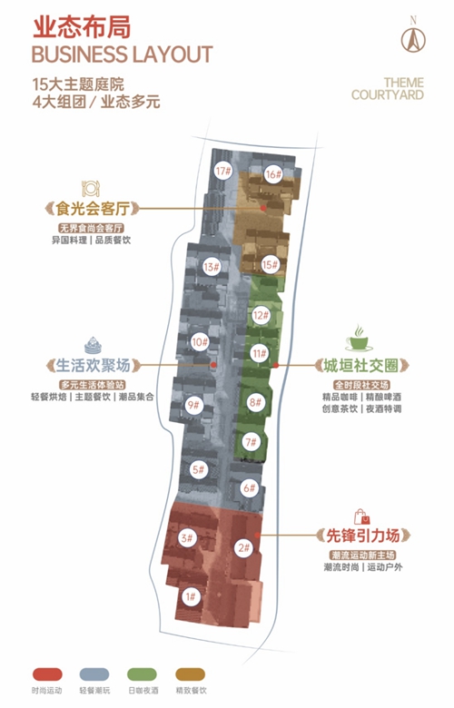 (十五個院落、四大組團(tuán)業(yè)態(tài)分布示意圖)