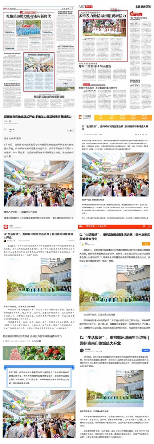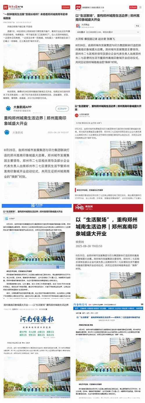 8月28日,鄭州城南商業(yè)格局迎來重大變革,由鄭州城市發(fā)展集團(tuán)與印力集團(tuán)攜手打造的鄭州嵩南印象城盛大啟幕,開業(yè)首日客流達(dá)12.6萬人次,迅速成為全城矚目的焦點(diǎn)。這一盛事引發(fā)了各大媒體的廣泛關(guān)注,河南日?qǐng)?bào)客戶端、頂端新聞、大象新聞、大河報(bào)、大河網(wǎng)、映象網(wǎng)、河南經(jīng)濟(jì)報(bào)、鄭州日?qǐng)?bào)、鄭州晚報(bào)、鄭州廣播電視臺(tái)等媒體紛紛聚焦,對(duì)其開業(yè)進(jìn)行了全方位、多角度的報(bào)道。