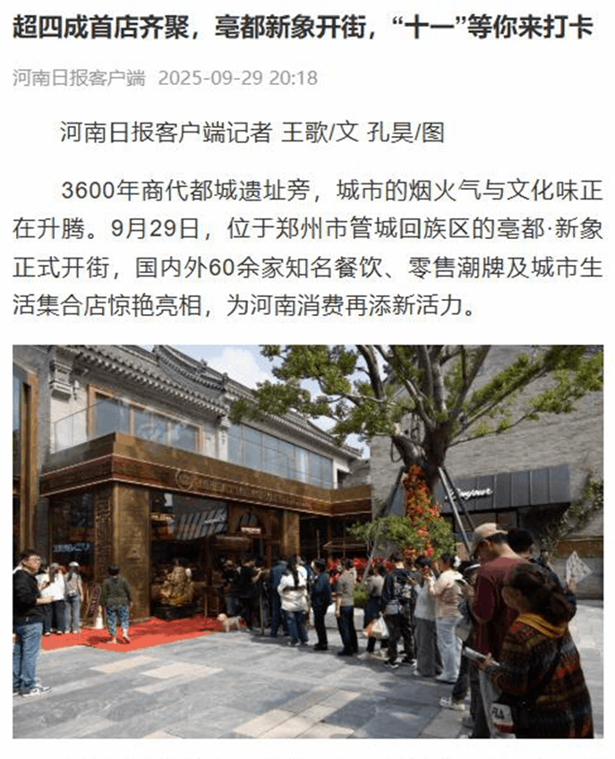 “亳都·新象”項(xiàng)目以“傳統(tǒng)風(fēng)貌現(xiàn)代文化商業(yè)街區(qū)”為定位,深度融合3600年商都文脈與現(xiàn)代商業(yè)活力,通過40%的首進(jìn)品牌占比和精心策劃的文商旅融合體驗(yàn),為鄭州打造彰顯商都魅力的“城市文化名片”與對外開放的“國際商都會(huì)客廳”。