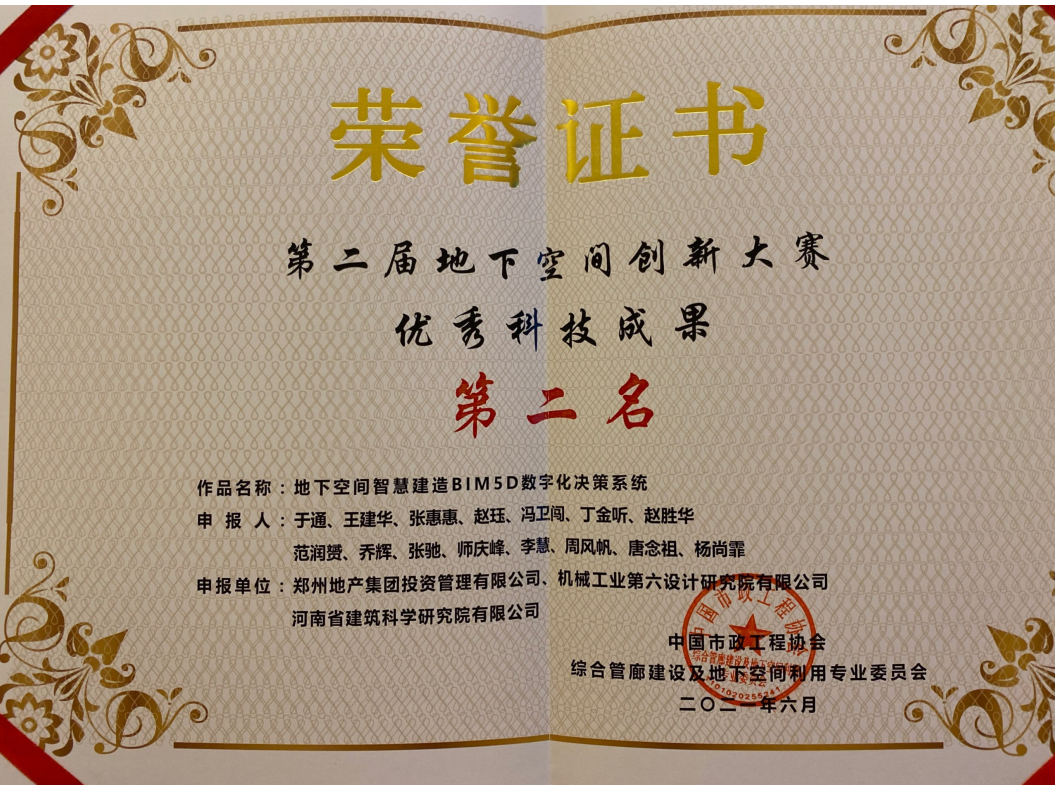 日前,鄭州地產(chǎn)集團(tuán)投資管理公司參賽作品《地下空間智慧建造BIM5D數(shù)字化決策系統(tǒng)》榮獲“全國(guó)地下空間創(chuàng)新大賽優(yōu)秀科技成果”第二名。